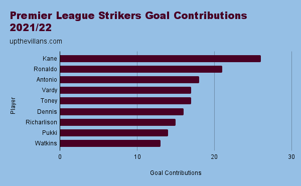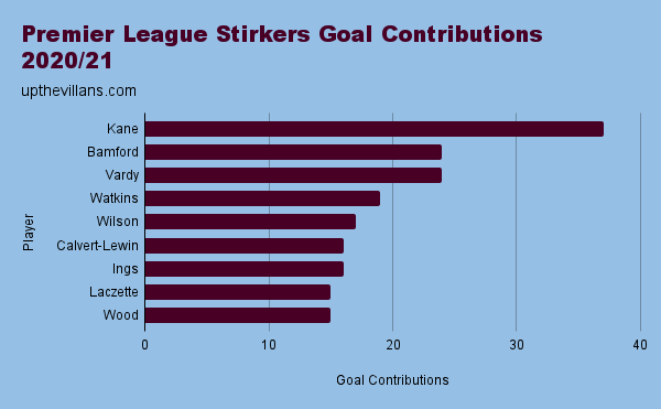 In Watkins’s debut season for Villa, he finished fourth among strikers for goal contributions in the Premier League (taking into account only traditional strikers). His 14 goals and 5 assists was bettered only by Harry Kane, Patrick Bamford and Jamie Vardy.