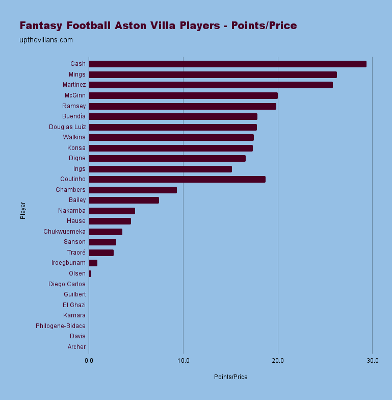 With a limited budget of 100, making the most of every penny is key to going the distance in Fantasy Football. So let’s take a look at each Villa player ranked in terms of points-per-price.